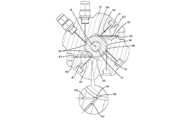 テイラー渦流式 連続晶析・反応装置TVF🄬のプロセス部への液流入に関する発明です。液流入に伴うプロセス部内のテイラークエット流の乱れを最小限に抑えることができます。当社発明(特許第7522444号)です。